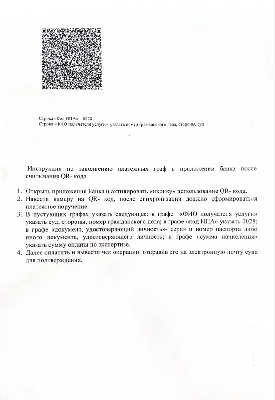 В этой связи, Воротынским районным судом Нижегородской области при согласовании и содействии Управления Судебного департамента в Нижегородской области были закодированы в виде QR-кода реквизиты для внесения денежных средств на спецсчет. Данный QR-код позволит стороне, на которую возложена оплата экспертизы внести денежные средства через онлайн-приложение банковского учреждения (например, Сбербанка России).